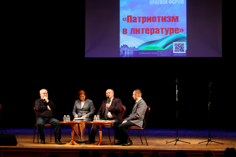 10 ноября в концертном зале Хабаровской краевой филармонии состоялся Первый краевой форум «Патриотизм в литературе». Форум проводился для школьников и молодежи Хабаровска. Среди спикеров и почётных гостей — известные авторы патриотических произведений.